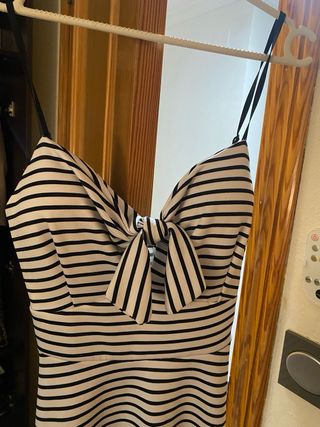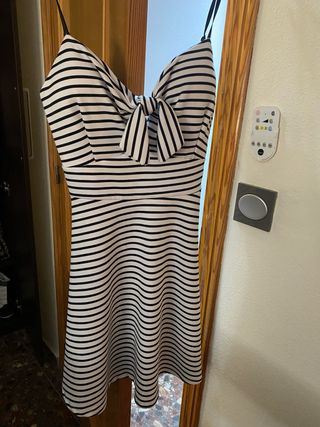 Vestido de verano con un diseño de rayas blancas y negras. - Escote con lazada. - Tirantes finos. - Corte acampanado.