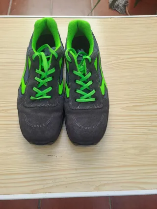 Zapatos de seguridad con un diseño moderno y llamativo. - Combinación de colores gris y verde. - Cierre con cordones. - Materiales resistentes.