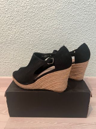 Alpargatas de cuña en color negro, con un diseño de tiras y lazada. - Muy poco usadas. - Material exterior de ante. - Suela de esparto.
