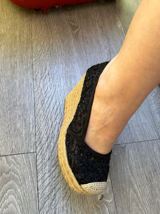 Zapatillas de esparto con cuña y detalle de crochet. - Material exterior de crochet. - Cierre con pulsera al tobillo. - Suela de esparto.Fue un regalo y m están grandes. Son muy bonitas.