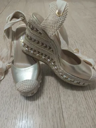 Zapatillas de esparto con cuña, a estrenar. - Material exterior textil con acabado brillante. - Cierre con cordones. - Suela de esparto.