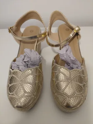 Alpargatas de cuña con un bonito diseño floral bordado. - Color dorado. - Talla 38. - Cierre de pulsera con hebilla. - Detalle de esparto en la suela.