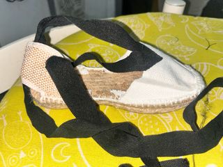 Esparteñas de estilo fallero, perfectas para lucir en fiestas. - Diseño en color beige con detalles en negro. - Cierre con cintas para atar al tobillo. - Suela de esparto y goma. Sin estrenar!!!!
