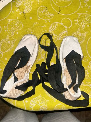 Alpargatas de estilo rústico con cintas para atar. - Diseño de esparto. - Combinación de colores beige y negro. - Suela mullida de Foam - Un solo uso - Comprada en La Casa de los Falleros.