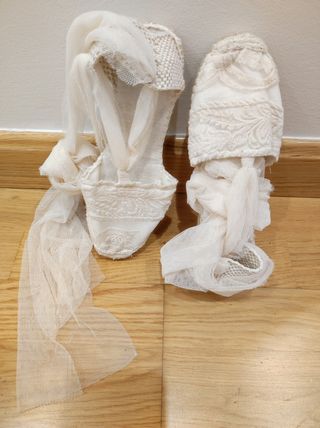 Alpargatas de novia . Las compré para mi boda, pero sólo las pude usar para la prueba. En mi día llovió. Son muyyy cómodas. Muy bonitas con encaje. Es la altura media 9 cms. Pregunta si tienes dudas.