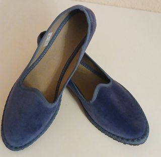 Alpargatas planas en terciopelo 100% de algodón suaves de color azul. Fabricadas artesanalmente con material reciclado y cosidas a mano, sencillas y cómodas, con suela de goma de neumático de bici reciclado. Sin usar fue un regalo y me están grandes. Numero: 40 Precio: 31 €. Negociable.