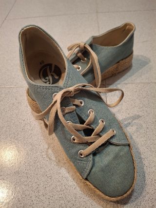 Zapatillas casual de color azul claro, con plataforma de esparto. Ideales para un look fresco y cómodo. - Son de lona. - Tienen cordones de color beige. - Están en buen estado.
