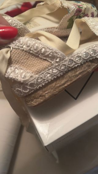 Alpargatas de estilo veraniego. Son preciosas, tienen una pequeña mancha en la parte del talón, como se muestra en la última imagien. Las vendo porque no me las pongo. Usadas 4 veces.