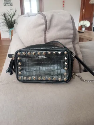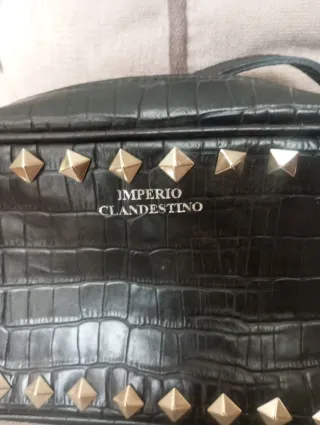 Bolso bandolera de la marca Imperio Clandestino. - Diseño con acabado efecto piel de cocodrilo. - Adornado con tachuelas metálicas doradas. - Incluye detalle de flecos. - Correa de cadena metálica.