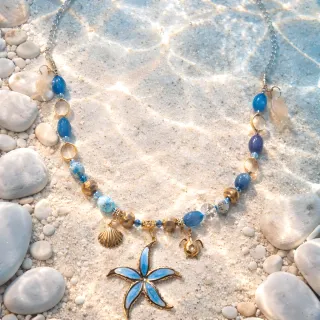 Collar Fresh con cuentas de cristal y cadena. Un accesorio delicado con un diseño inspirado en el mar. - Cuentas de cristal en tonos azules y dorados. - Colgantes con forma de estrella de mar, concha y tortuga. - Cadena metálica ajustable.