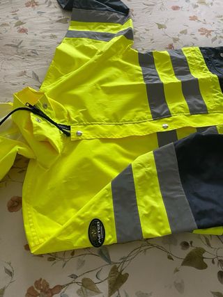 Impermeable de alta visibilidad. Una pequeña mancha que se ve en una de las fotografías, de estar guardado. No se llegó a usar. - Diseño con cintas reflectantes. - Cierre frontal.