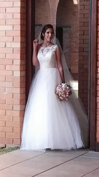 Vestido de novia estilo princesa, con un diseño elegante y romántico. - Cuerpo con detalles de pedrería. - Falda voluminosa de tul. - Incluye velo.