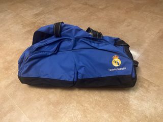 Práctica bolsa de viaje con el escudo de la Fundación Real Madrid. - Color azul principal con detalles en negro. - Asas de mano y correa para hombro.
