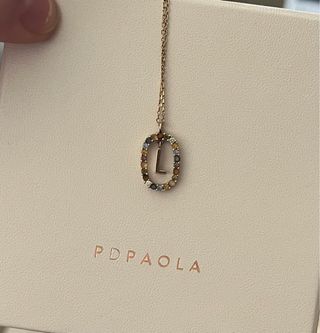 Vendo collar PDPaola con inicial “L” multicolor en acabado dorado. Es un diseño muy elegante con piedras de colores alrededor de la letra. Lo he usado solo un par de veces, está en muy buen estado pero ya no lo utilizo. Incluye todo lo original: Caja PDPaola Certificado Bolsa de tela original Limpiador PDPaola sin usar