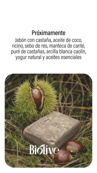 Jabón artesanal con castaña hecho con el método de saponificación en frío. - Pieles normales,secas o maduras y sensibles. - La Castaña rica en azúcares naturales, minerales y antioxidantes. Aporta suavidad, hidratación y efecto calmante. Da un toque sedoso y acondicionador al jabón. - Elaborado con ingredientes naturales Aceite oliva virgen extra, aceite de coco Virgen 1° presión en frío, Manteca de Karité, aceite de Ricino, manteca Res clarificada, arcilla blanca kaolín, lactato de sodio, yogurt griego natural, aceites esenciales de: Cedro de altas, amyris, clavo, canela, benjuí, Romero, geranio. Instagram @biolive._