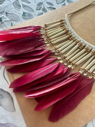 Pack de dos collares: - Colgante de plumas en tono burdeos con detalles metálicos en dorado y base de collar en color crudo. - Colgante de pedrería en tonos variados con detalles dorados.