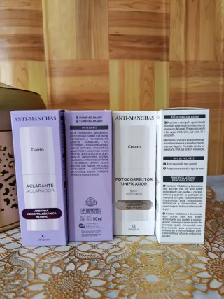 Lote de cuatro cremas faciales Deliplus para el tratamiento de manchas. - Dos unidades de Fluido Aclarante. - Dos unidades de Crema Fotocorrectora Unificadora. - Ingredientes: Arbutina, Ácido Tranexámico, Retinol, Niacinamida, Carnosina, Glutationa. - Protección solar SPF 50 UVA+UVB+IR.