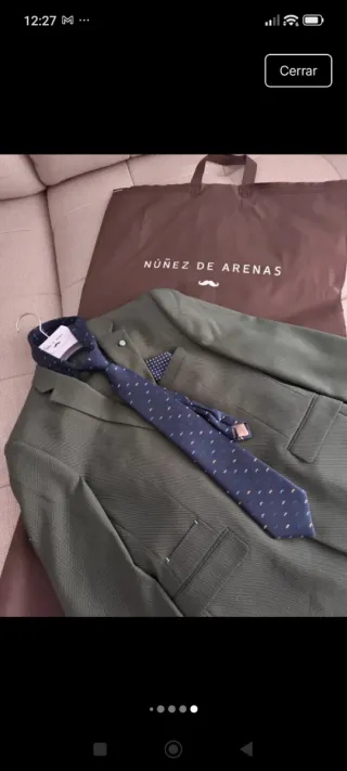 Conjunto de traje de vestir de la marca NÚÑEZ DE ARENAS. - Chaqueta de traje. - Corbata azul con estampado. - Pañuelo de bolsillo con estampado. Perfecto estado. Pantalón pitillo y americana entallada. Temporara primavera verano.