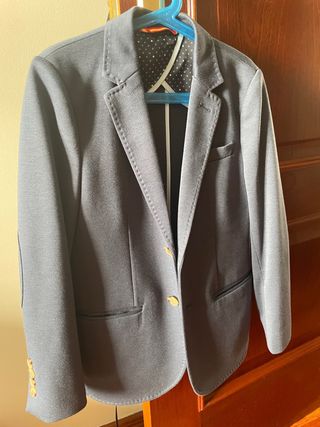 Chaqueta tipo americana de color azul. Presenta un diseño clásico y elegante. -Talla 12. 152cm -Nueva sin uso. - Cierre de doble botón. - Bolsillos frontales. - Forro interior con estampado de puntos. -Envio a cargo comprador. -Precio Tienda 49,95€