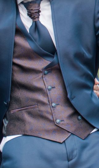 Traje de dos piezas para novio o eventos especiales. - Chaqueta azul marino con solapa de muesca. (talla 52) - Chaleco con estampado floral en tonos marrones y azules. (talla 52) - Cierre de botones en el chaleco. - Pantalón azul marino (talla 52/46) (Precio original 1.175 euros) - Regalo camisa Passport (talla 52, equivalente a una L). (Valor 90 euros) - Regalo zapatos (43) y cinturón en tonos marrones. (Valor 70 euros) Algo negociable