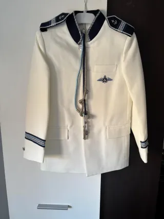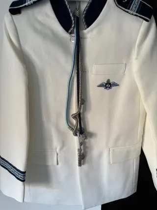 Traje de almirante con detalles marineros. - Hombreras con anclas. - Insignia de aviación en el pecho. - Puños con banda decorativa.