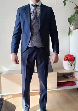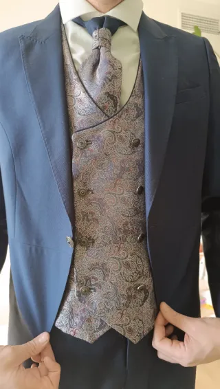 Traje de hombre en color azul, usado solo una vez durante unas tres horas. Se encuentra en perfecto estado. - Chaqueta y pantalón a juego. - Diseño clásico y elegante.