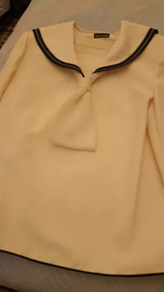 Traje de comunión de la marca Barcarola en color beige. Diseño elegante con cuello marinero y lazada. - Cuello marinero con ribete azul marino. - Lazada frontal. - Bajo con ribete azul marino.