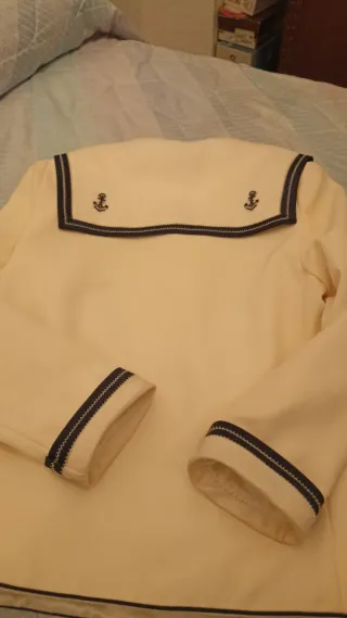 Conjunto de traje de comunión para niño, con un diseño marinero. - Chaqueta azul con detalles blancos en cuello y puños. - Pantalón blanco. - Cuello marinero con lazada. -Zapatos Largo pantalón 32 Ancho cintura 24 Pecho 34 Largo de manga 19