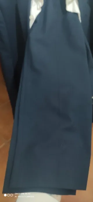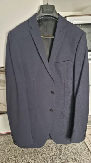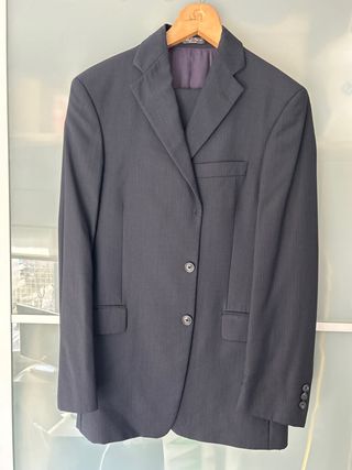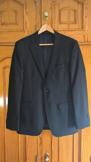 Traje de chaqueta de color azul marino. Usado una única vez - Chaqueta talla 50 - Pantalón talla 46 Medidas: De hombro a hombro 46cm. Largo de la chaqueta 74cm aprox. Ancho de la cintura del pantalon: 48cm aprox