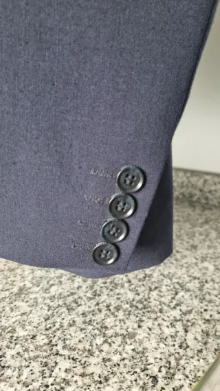 Chaqueta y pantalón de traje elegante. - Color azul marino . - Cierre de tres botones. - Dos bolsillos frontales. - Puños con botones.