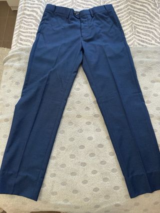 Elegante traje azul marino de la marca Núñez de Arenas. Perfecto para eventos especiales, graduación, boda, comuniones o bautizos. La tela es de rayas muy finitas en dos tonos de azul( uno más oscuro y otro azul eléctrico) lo que da una sensación sutil de brillo. Corte Slim. Medidas chaqueta: - Ancho Espalda(de hombro a hombro): 44cm - Largo espalda: 73cm - Brazo: 63 - Hombro: 14cm - Ancho cintura: 47cm Medidas pantalón: - Ancho cadera: 40 - Largo: 97/ 98 cm - Tiro: 29cm - Ancho pierna (parte baja): 17 Se puede probar.