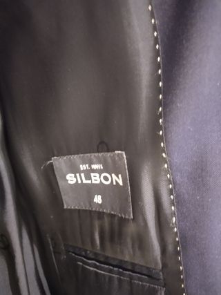 Elegante americana de la marca Silbon, en azul marino. Pantalón talla 40. Es una prenda de vestir impecable. Agujerito imperceptible cuello americana de ahí su precio. - Talla 48.talla 40 pantalon - Corte clásico. - Tejido de calidad.