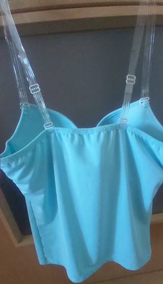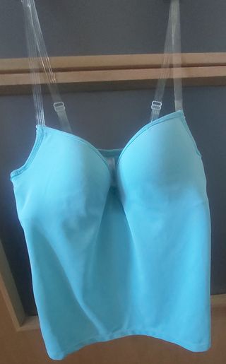 Top buen estado color azul turquesa. Copas integradas.Tirantes transparentes perfectos para americana. Sirve como top, lencero o exterior. Sienta de maravilla por la cuidada confección de la marca Steffy Sas-Zac. Tejido poliester y elastán. Talla equivalente a "S". Medidas en las últimas fotografías. Poco uso. Precio compra 75 eur.