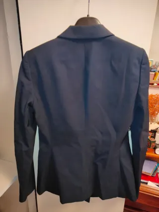 Americana de Massimo Dutti en color azul marino. - Corte clásico. - Cierre de un botón. - Bolsillos frontales con solapa. - Detalle de botones en los puños. -Entallada a la figura. -Talla S -Ha sido usada y muy cuidada aunque amarillea un poco en la zona del cuello (se ve en la foto)