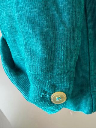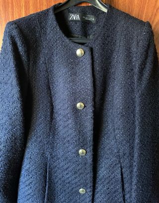 Americana de Zara con un diseño texturizado y elegante. - Color azul vibrante. - Cierre de un botón. - Bolsillos frontales. - Cuello solapa. Prácticamente nueva, se ha usado 2 veces. Vale como abrigo finito para entretiempo porque es larguita