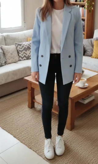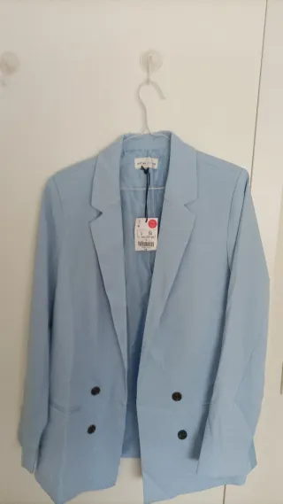 Americana blazer de color azul celeste, sin botones y con un diseño abierto. - Ligeras hombreras - Corte moderno y elegante. - Mangas enrolladas. - Forro interior de color crema. Es la talla M del Primark, por lo que corresponde más bien a una 40.