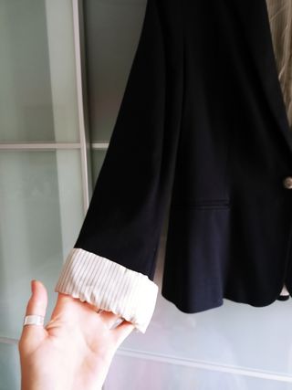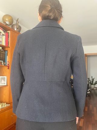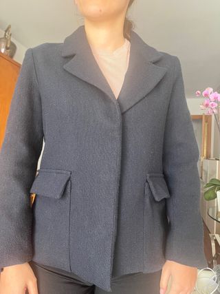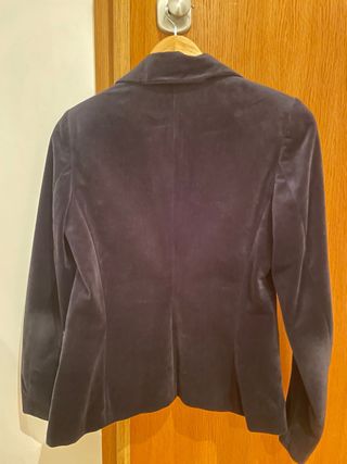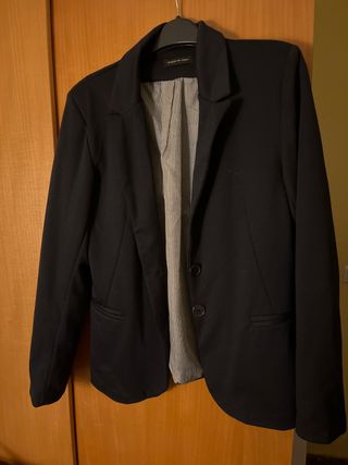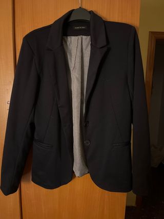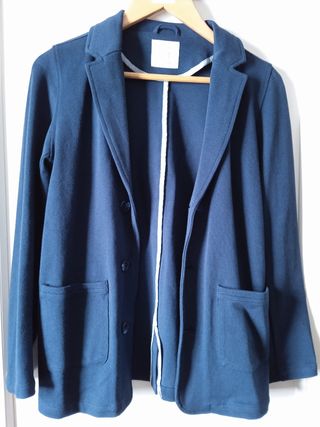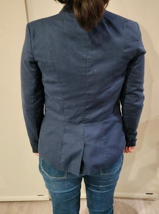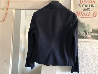 Americana azul marino ( es un poco más claro del que sale en la foto. es un color súper bonito y muy elegante) Esta como nueva. Tiene forro diplomático para que las mangas vayan dobladas y le de un toque de estilo. Tejido fluido, muy estiloso y con caída. Queda genial. La vendo porque he subido dos tallas y no me entra. Es de Zara talla L. pero queda pequeña, yo diría que es 38/40.