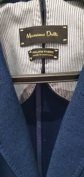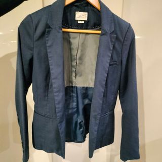 Americana azul marino de Mango. la forma es monísima y sienta súper bien. - Diseño clásico con un solo botón. - Solapa de muesca. - Bolsillos con solapa. le falta la etiqueta del cuello pero está la otra etiqueta donde se ve la talla, marca y composición