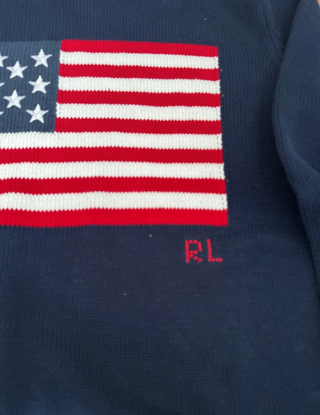 Sudadera de punto azul marino de Polo Ralph Lauren con un diseño de la bandera de Estados Unidos. Casi no usada, tiene una manchita pequena pero se lava. en perfecto estado - Diseño de la bandera americana en el pecho. - Cuello redondo. - Puños y bajo acanalados. precio negociable