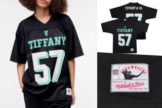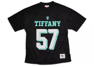 Camiseta estilo fútbol americano de Tiffany & Co. con detalles en color verde azulado. - Diseño con el número 57 y el nombre TIFFANY. - Parche de Mitchell & Ness THROWBACKS en la parte inferior.