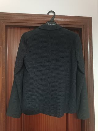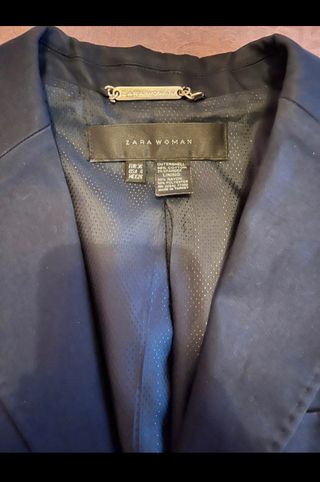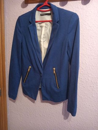 Chaqueta blazer americana azul de Zara talla 38 M de mujer, poco uso. Tiene un enganchoncico pequeño en la manga izda pero apenas se nota, adjunto foto. Y un roce en el botón de delante pero tampoco se nota mucho. Lleva hombreras y forro azul marino interior. Marca Zara Basic, en etiqueta pone talla L pero da como una talla 38 M. Medidas: 40 cm ancho hombros x 56 cm largo x 42 cm ancho cintura (84 cm contorno entero). Mangas miden 61 cm largo x 14 cm ancho (28 cm contorno). 95% viscosa 5% elastán. Si eres de Zaragoza se puede recoger en San José, Aragonia o Parque grande.