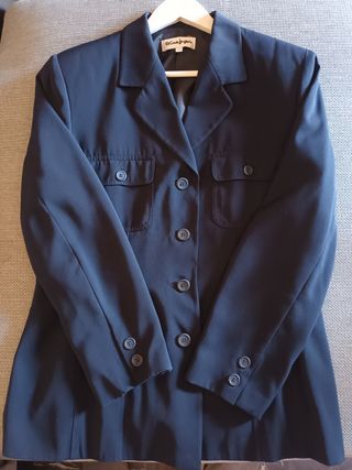 Chaqueta tipo americana en azul marino . Bolsillos de plaston con tapeta y botón sobre el pecho. Semi entallada. Talla 44 de El corte inglés. Usada 2 veces. No da demasiada talla.