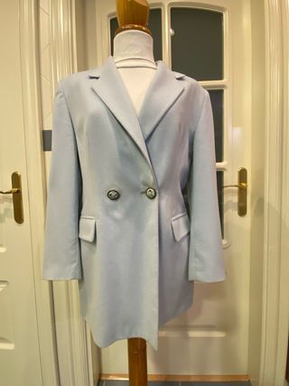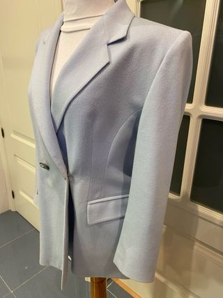 Americana de micropana color azul cielo. Entallada, con un boton y largura media. Da poca talla