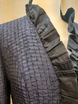 Americana de mujer, azul marino. con brillos tornasolados. Manga larga, sin forrar. Cierre con botones. Elegante volante negro que adorna la chaqueta. Entallada con costadillos delanteros y traseros. No tiene bolsillos. Con finas hombreras 78% poliester, 22 % rayón. Talla 44
