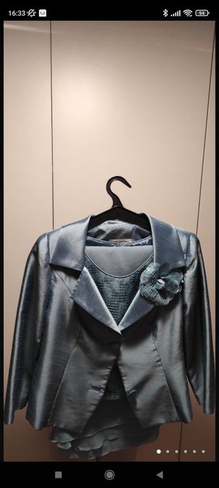 Traje de tres piezas en tono azul, de Franc Sarabia, hecho a medida, talla 46/48. medidas: 100 cm pecho, cintura 92 y cadera 115. Usado solo una vez. Compuesto de americana corta de seda salvaje, falda de gasa con godé y cuerpo sin mangas a juego, se abrocha con cremallera a la espalda. Regalo zapatos n° 37 a juego, forrados de seda azul.