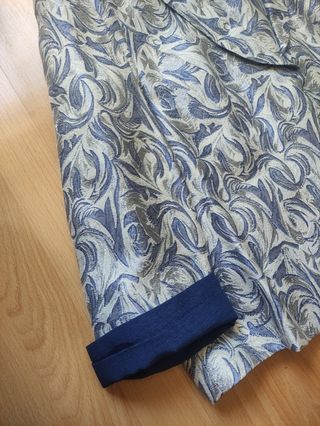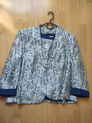 Traje de madrina de tres piezas. Americana con hombrera fina, con vuelta en la manga, estampado muy bonito, abierta. Blusa con manga corta, también con hombrera fina, se cierra por un lado con cremallera. Entallada. La falda azul marino dobles en el bajo y forrada completa. Llevado solo el una ocasión y limpio de tintorería Talla 54.
