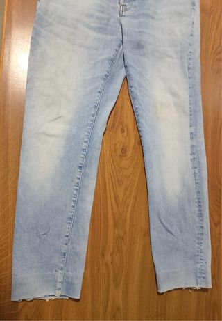 Pantalones vaqueros azules de estilo desgastado. Son de tiro medio y corte recto. La talla no viene porque es talla je americano; se cree que es una M. - Tienen un aspecto desgastado y ligeramente deshilachado en el bajo. - La tela es suave y cómoda. - Tiene una pequeña mancha marrón en la una de las piernas.