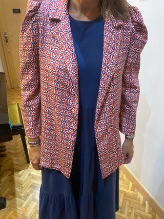 Americana de mujer con un estampado llamativo. - Diseño con hombros abullonados. - Corte abierto. - Estampado geométrico en tonos rojos y azules.