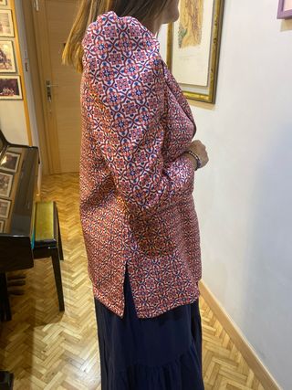 Americana forrada de color verde/beige con motivos florales con hilos de seda brillante en tonos ocres y azules. usada solo una vez.