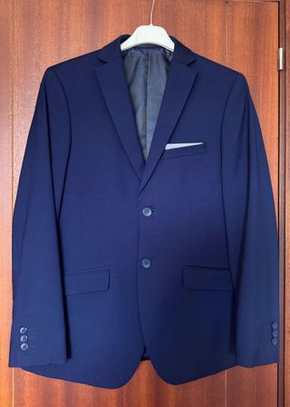 Elegante traje azul marino para joven. Ideal para eventos especiales. - Chaqueta de dos botones. - Pantalones con pinzas. - Incluye pajarita,y pañuelo a juego Dos trajes,uno talla pantalón 36 chaqueta talla 40 Otro traje,pantalón talla 40, chaqueta talla 44
